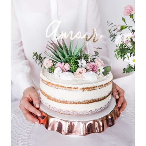Ce cake topper intègre deux pics en bois et un découpage doré du mot Amour.
